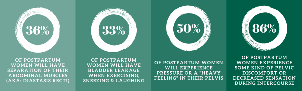 Even though a woman may look “back to normal” on the outside, very often the pelvic floor & abdominal muscles are still weak from pregnancy & birth.